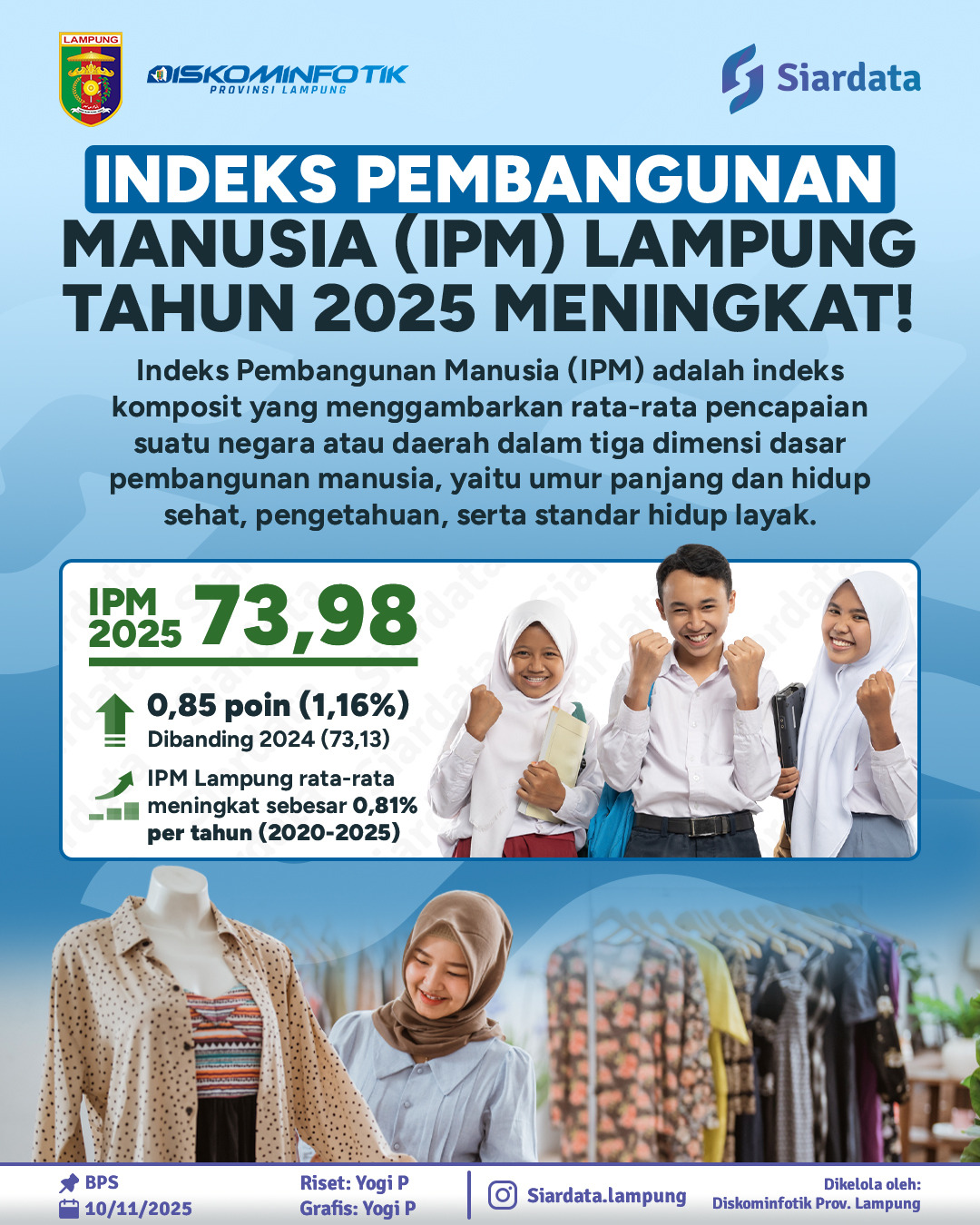 Indeks Pembangunan Manusia (IPM) Provinsi Lampung tahun 2025 mencapai 73,98, meningkat 0,85 poin (1,16%) dibanding tahun 2024.